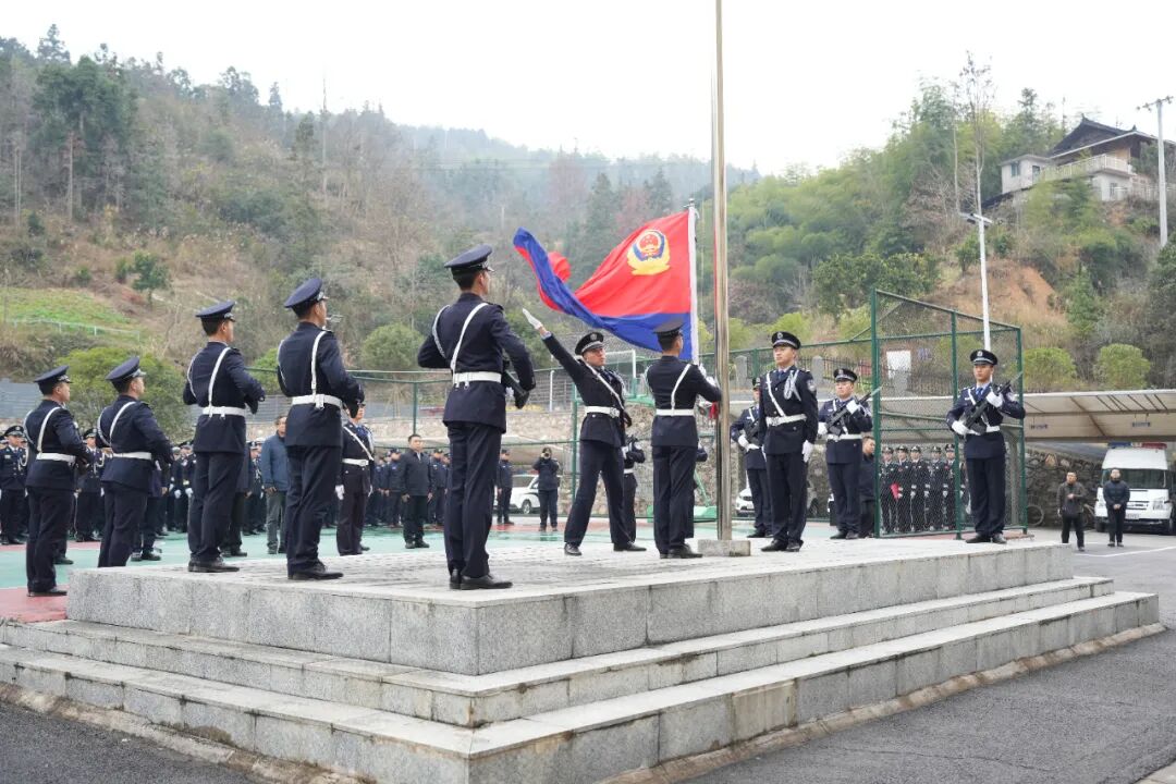上午9时,伴随着雄壮激昂的《中国人民警察警歌》,鲜艳的警旗冉冉升起。全体民警、辅警身着警礼服,队列整齐、士气高昂,面向警旗庄严敬礼,以最昂扬的姿态重温着对党和人民的忠诚承诺。