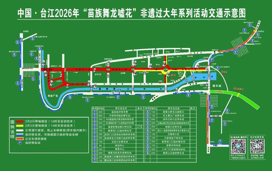 敬请广大市民群众相互转告,自觉遵守交通法规及管制措施,安全文明出行,服从现场交警和停车引导员的指挥,遇到车辆缓行依次排队等候。台江“舞龙嘘花”欢迎您,祝您及家人安全出行,旅途愉快!