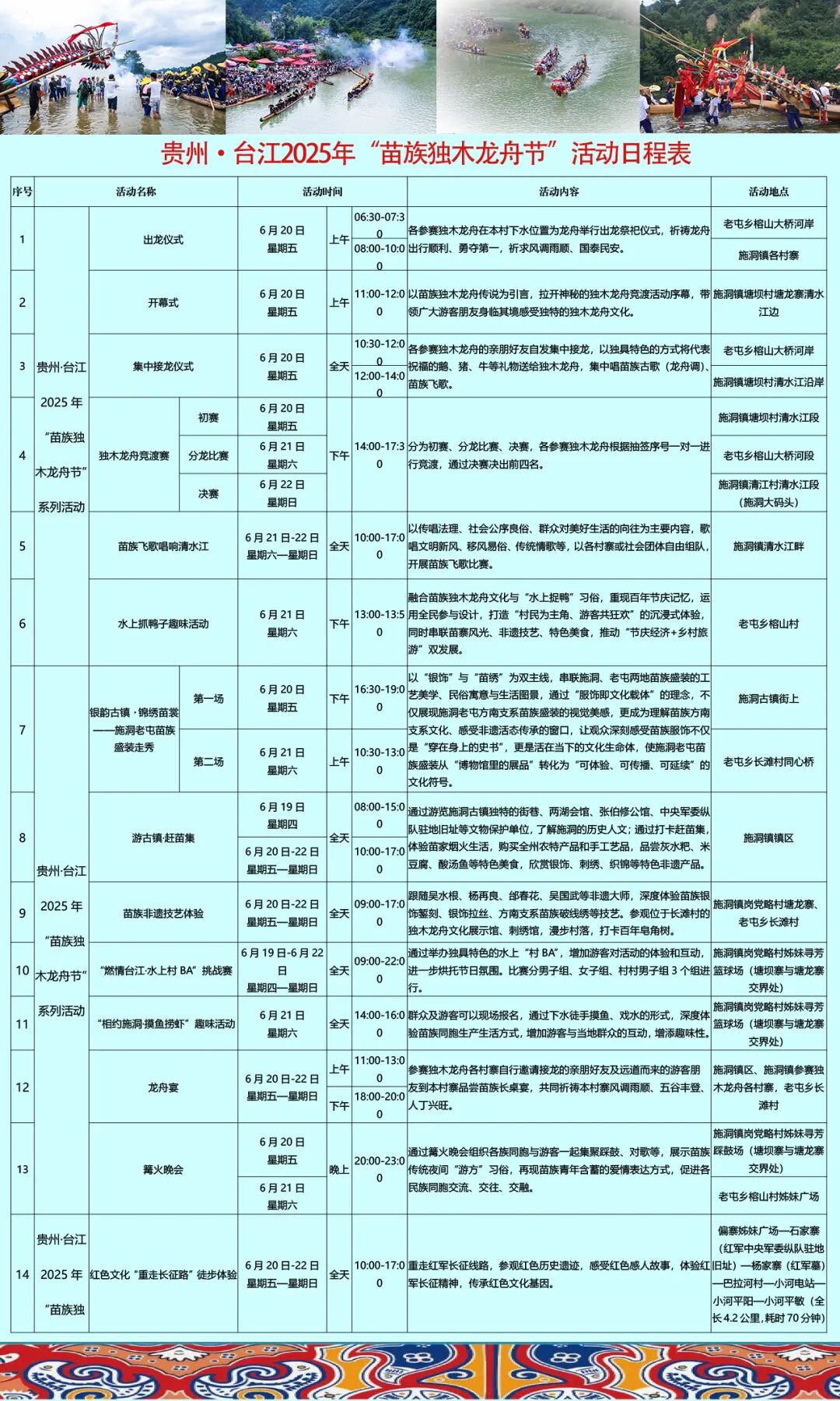 今年的台江2025年苗族独木龙舟节将于6月20日—22日,在台江县施洞镇、老屯乡清水江、巴拉河两岸举行。苗族独木龙舟节期间,主要开展出龙仪式、开幕式、集中接龙仪式、独木龙舟竞渡、水上抓鸭子、苗族非遗技艺体验、篝火晚会、民间文艺表演、吃“龙肉”等活动。