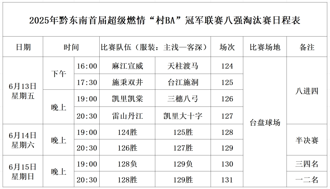 6月13日凌晨0点26分,最后一场比赛的终场哨响,黔东南州首届超级燃情“村BA”冠军联赛16进8淘汰赛阶段正式落下帷幕。根据赛程安排,4强争夺赛将于6月13日16:00打响,比赛依旧采用单场决胜制,胜负悬念陡增,竞争将更加白热化。期待接下来各队的精彩表现!