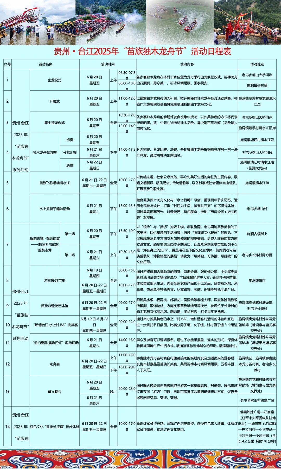 因受天气影响,河道涨水。为确保活动安全有序, 原定6月20日举行的贵州·台江2025年苗族独木龙舟节龙舟竞渡活动暂时取消,活动延期时间,暂调整至6月22日(星期日)上午9:00举行,具体安排视当天情况而定,请各位游客朋友出行注意水上及交通安全。