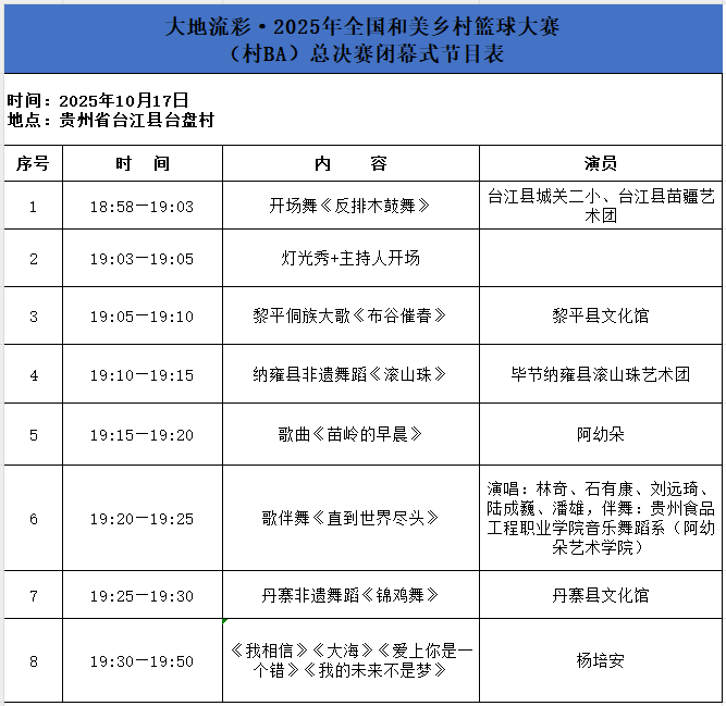 大地流彩·2025年全国和美乡村篮球大赛(村BA)总决赛闭幕式节目表来了