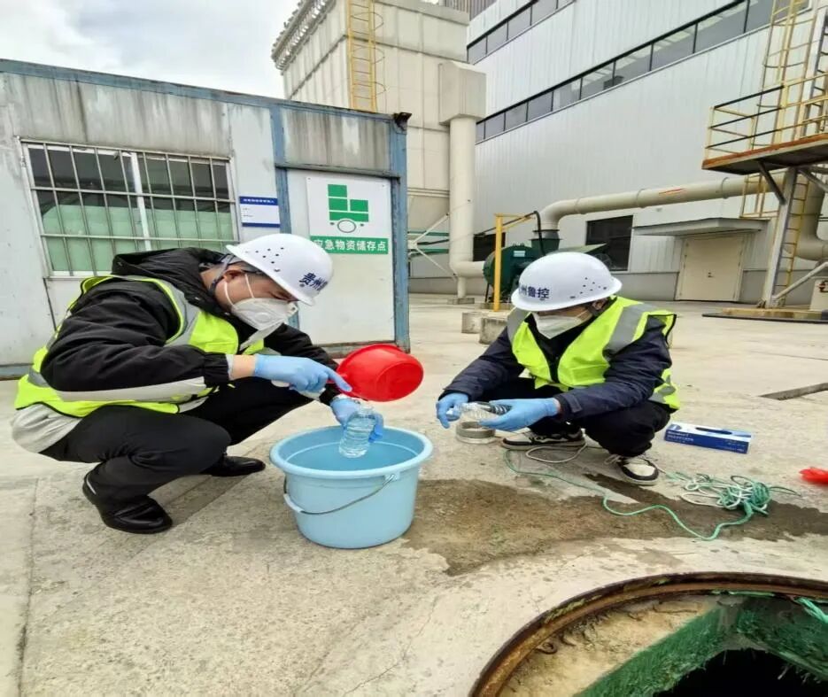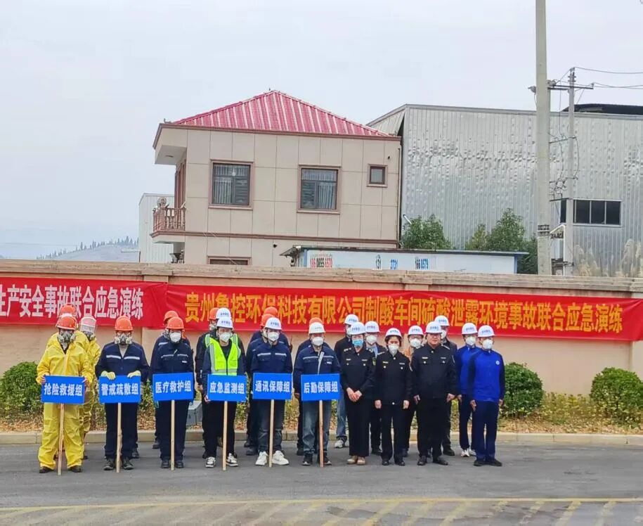本次应急演练模拟贵州鲁控环保科技有限公司制酸车间装酸槽设备故障,导致装酸槽硫酸溢出并发生剧烈反应,最终引发火灾及造成人员受伤的场景。突发事件发生后,相关部门立即启动突发环境事件应急预案,成立应急处置组、抢险救援小组、应急监测组、后勤保障组、通讯保障组、警戒疏散组、医疗救护组等7个小组。各小组按照突发环境事件应急预案启动响应,警戒疏散组开展现场警戒、有序疏散周边人员,抢险救援组迅速连接消防水带将火扑灭,医疗救护组完成“受伤人员”救治转运,通讯联络组指示其余各应急小组及时对厂内雨水口进行封堵并对污染的水体进行快速、安全的收集处理,应急监测组对应急池废水及周边水进行取样检测。